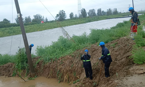 東營華昌電力工程有限公司抗擊臺風“利奇馬”現(xiàn)場:搶修傾斜電桿。